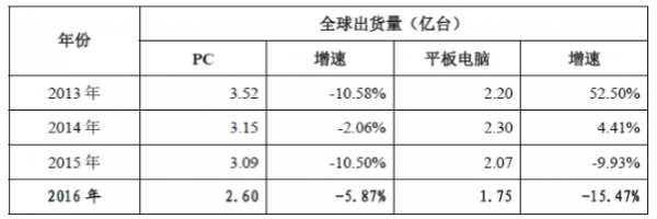 在移動智能終端的沖擊下,國際PC 產量持續萎縮,而平板電腦產量也經歷了較大波動。2013-2016 年,PC 產量從3.52 億臺下降到2.60 億臺,平板電腦產量則依年為2.20 億臺、2.30 億臺、2.07 億臺和1.75 億臺。PC 和平板電腦市場相關廠家因此也加速發展“二合一”式筆記本電腦的步伐。