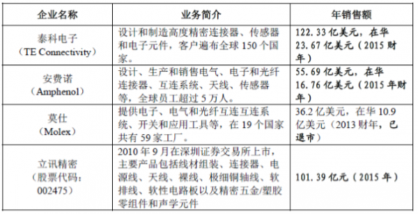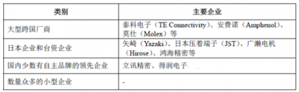目前, 全球連接器銷售額最大的三家供應商為泰科電子( TEConnectivity)、安費諾(Amphenol)和莫仕(Molex),研發水平高,產品種類多、應用廣泛,業務布局面向全球,是連接器的領先供應商。國內連接器的領先企業以立訊精密為代表,產品主要面向3C 產業開發。