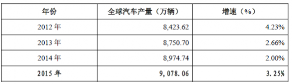 在中國汽車市場持續繁榮的拉動下,全球汽車產量實現了穩步增長。2012-2015 年全球產量由8,423.62 萬輛增長至9,078.06 萬輛,年均復合增長率分別為3.38%。